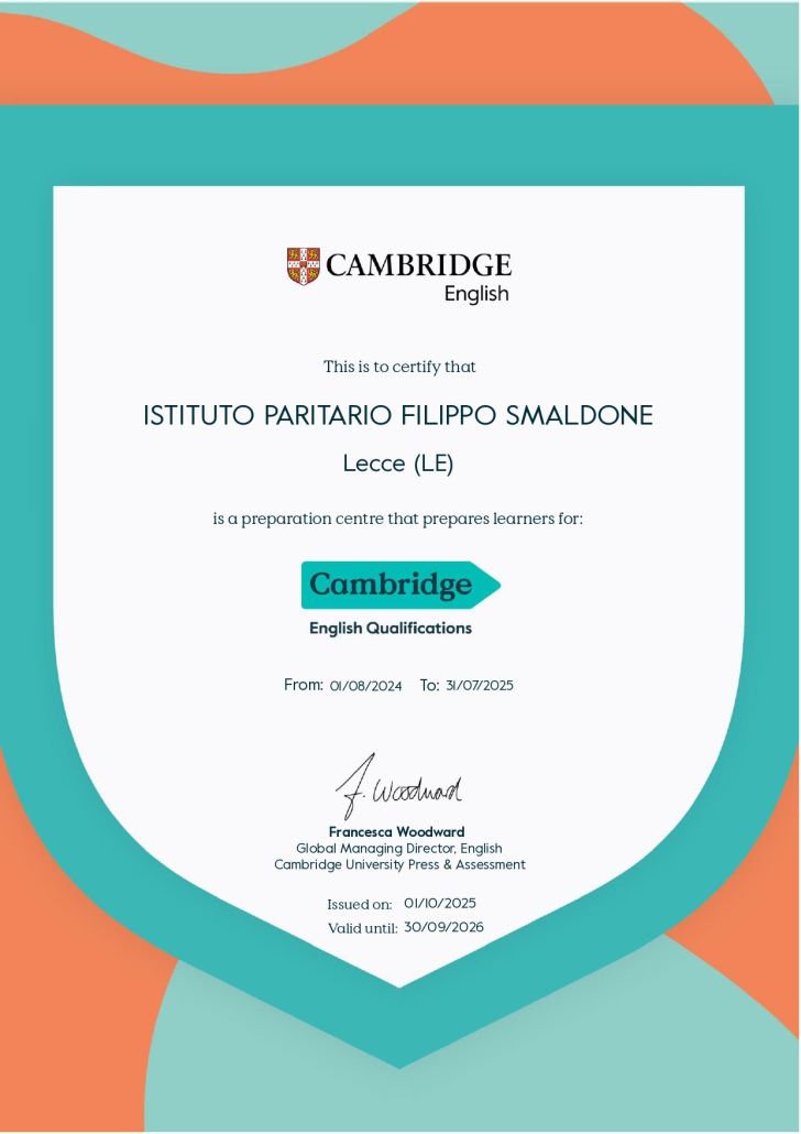 Una buona conoscenza della lingua inglese, sostenuta dalla giusta certificazione, può offrire agli studenti un vantaggio competitivo. Forte di questa convinzione, l’Istituto Filippo Smaldone offre lezioni gratuite di preparazione all’esame Cambridge in orario curricolare con un insegnante madrelingua.